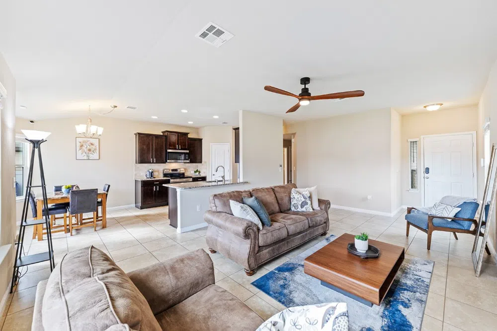 Welcome to this inviting home that perfectly blends comfort and functionality! As you step inside, you’re greeted by a spacious living room full of natural light. The open flow into the kitchen and dining area enhances the sense of space, making it easy to entertain friends and family or enjoy quiet evenings in. From the main living area, a hallway leads to two cozy bedrooms. This wing of the home also includes a full bath and a laundry closet, and access to the attached garage offering an effortless transition from the car to the home. Beyond the kitchen, the primary bedroom awaits—a private retreat with abundant natural light. The layout is perfectly suited for any lifestyle, balancing shared spaces with private areas to meet a range of needs.