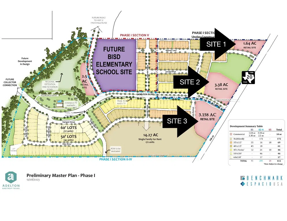 This prime retail site is in Adelton, Bastrop’s newest master-planned community, which is set to include 1,500 residential units and 150,000 square feet of commercial space—bringing plenty of built-in traffic and demand. Spanning 3.382 acres, this property sits at the high-visibility corner of FM 20 and Adelton Blvd, with approximately 357 feet of frontage on FM 20 and 372 feet on Adelton Blvd. Plus, it's completely outside the FEMA 100-year floodplain. All utilities will be stubbed to the site, making development even easier. Priced at $7.50 per square foot, this is a great opportunity to bring retail to a fast-growing community!
